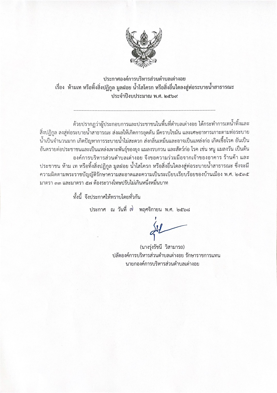 ประกาศ เรื่อง ห้ามเท หรือทิ้ง มูลฝอย น้ำโสโครก หรือสิ่งอื่นใดลงสู่ท่อระบายน้ำสาธารณะ ประจำปีงบประมาณ พ.ศ. 2569 12 พฤศจิกายน 68kalongadminข่าวประชาสัมพันธ์ อ่านแล้ว : 87 ประกาศ เรื่อง ห้ามเท หรือทิ้ง มูลฝอย น้ำโสโครก หรือสิ่งอื่นใดลงสู่ท่อระบายน้ำสาธารณะ ประจำปีงบประมาณ พ.ศ. 2569 | องค์การบริหารส่วนตำบลเต่างอย อ.เต่างอย จ.สกลนครFacebookประกาศ เรื่อง ห้ามเท หรือทิ้ง มูลฝอย น้ำโสโครก หรือสิ่งอื่นใดลงสู่ท่อระบายน้ำสาธารณะ ประจำปีงบประมาณ พ.ศ. 2569 | องค์การบริหารส่วนตำบลเต่างอย อ.เต่างอย จ.สกลนครXประกาศ เรื่อง ห้ามเท หรือทิ้ง มูลฝอย น้ำโสโครก หรือสิ่งอื่นใดลงสู่ท่อระบายน้ำสาธารณะ ประจำปีงบประมาณ พ.ศ. 2569 | องค์การบริหารส่วนตำบลเต่างอย อ.เต่างอย จ.สกลนครLine
