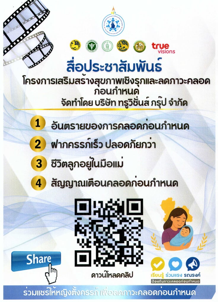 ขอแจ้งสื่อประชาสัมพันธ์ตามโครงการเสริมสร้างสุขภาพเชิงรุก เพื่อลดภาวะคลอดก่อนกำหนด โดยสามารถดาวน์โหลดคลิปวิดีโอได้ที่ https://drive.google.com/drive/folders/1VD1VSMNFdQsAsfoxS6t-Lou8pGi478dq หรือ QR Code ด้านล่างนี้